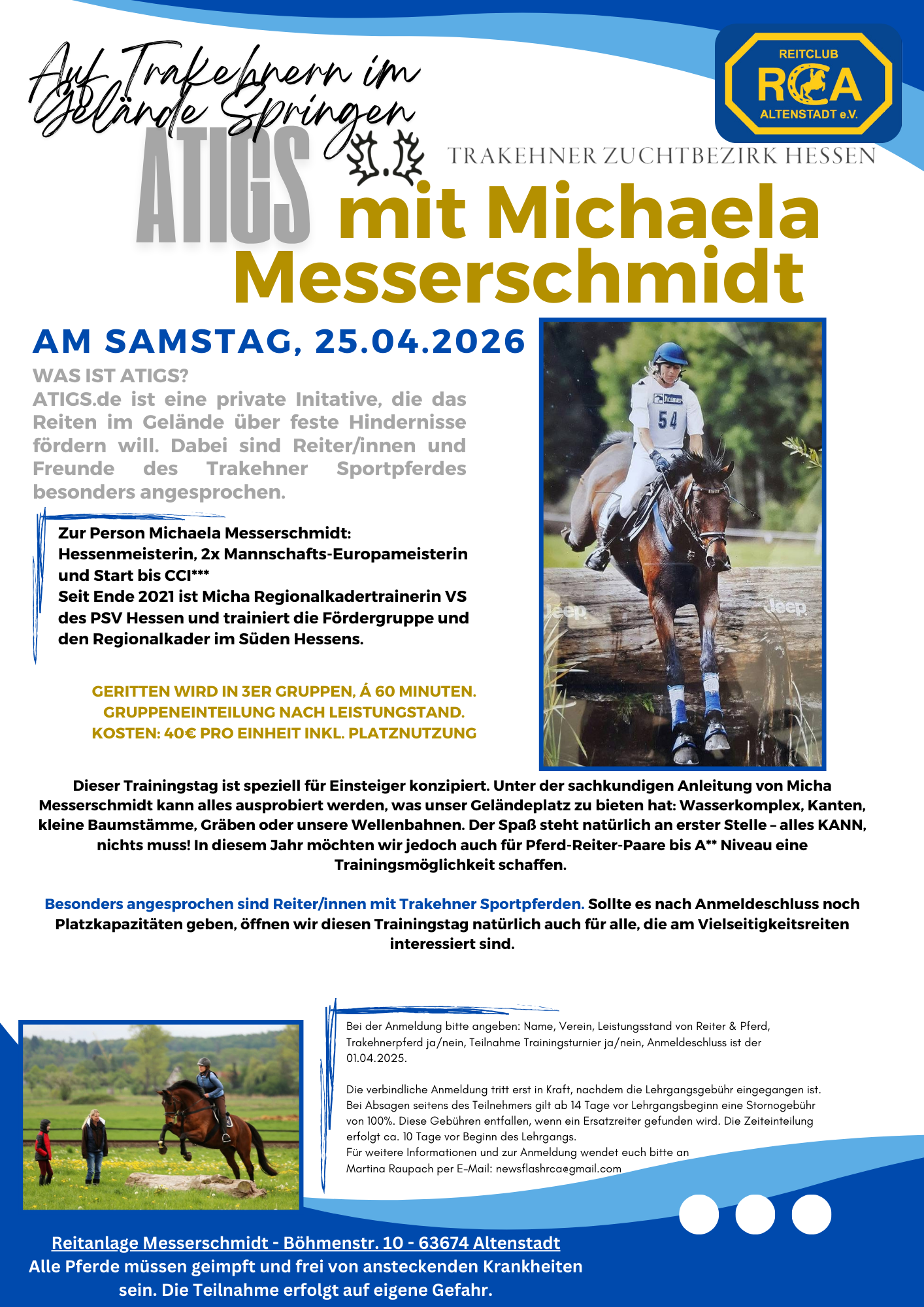 Sollte nach Anmeldeschluss Platzkapazitäten vorhanden sein, öffnen wir diesen Trainingstag natürlich auch für alle, die am Vielseitigkeitsreiten interessiert sind.